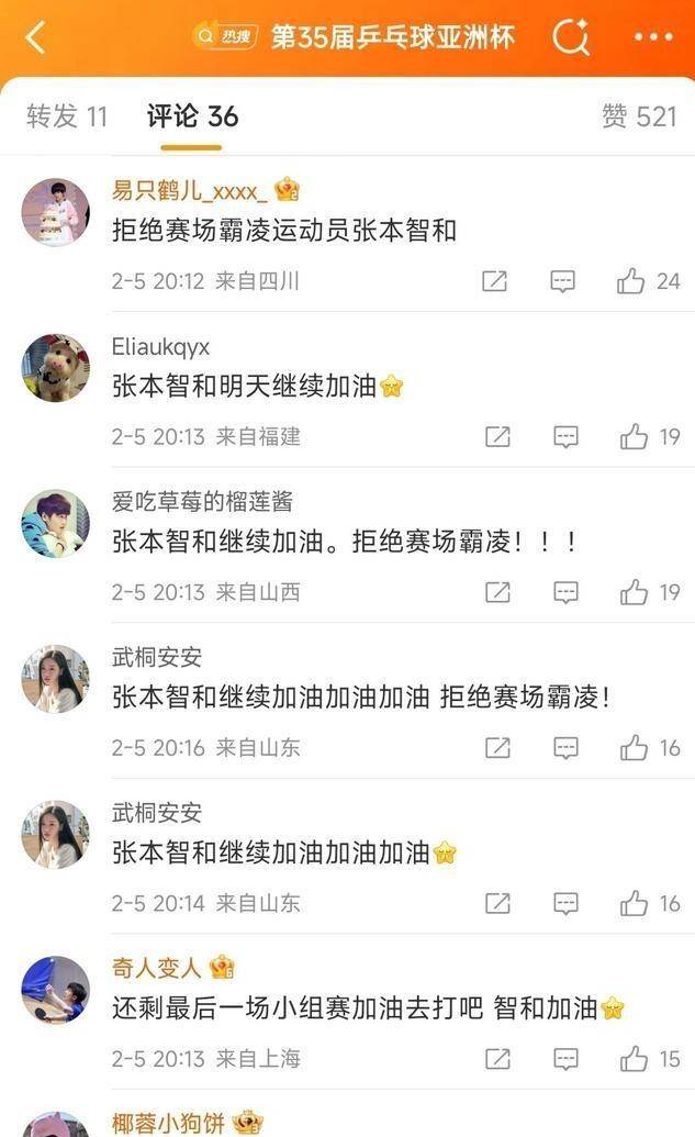 这股风气也蔓延到了网上。 在亚乒联官方账号下,评论区经常被“心疼张本”、“拒绝网络暴力”的留言刷屏。